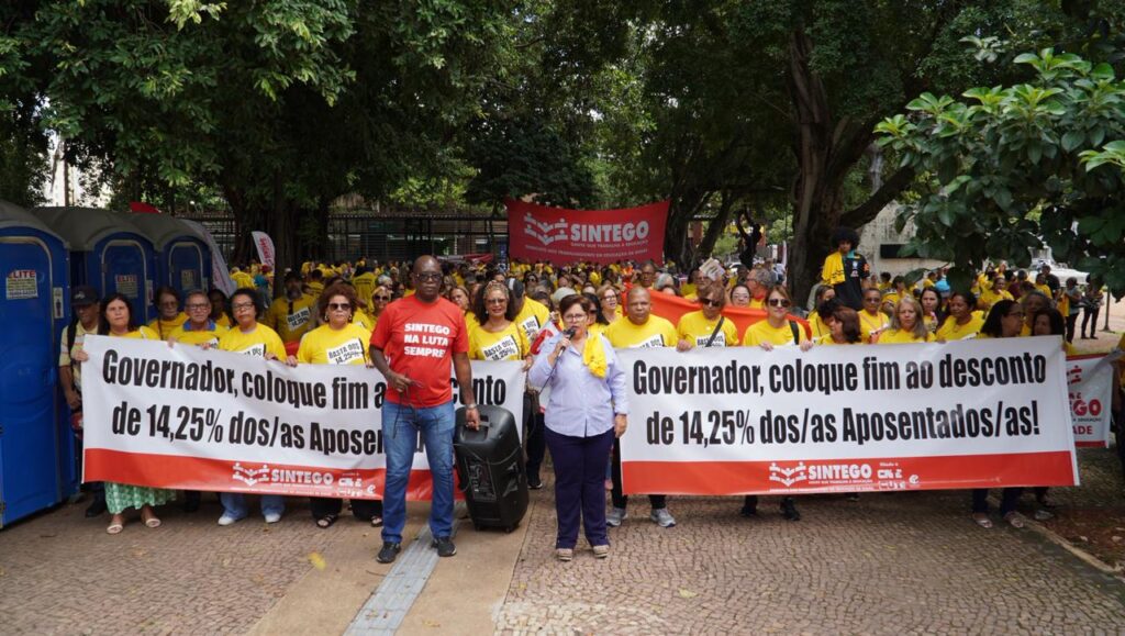 A deputada estadual Bia de Lima (PT), que também é presidenta do Sindicato dos Trabalhadores em Educação de Goiás (SINTEGO), liderou nesta quarta-feira (5/3) uma grande mobilização em frente ao Palácio das Esmeraldas, em Goiânia, em defesa dos aposentados e aposentadas do estado. O ato reuniu servidores que cobram o fim do desconto de 14,25% da contribuição previdenciária, mantido mesmo após décadas de dedicação ao serviço público.
